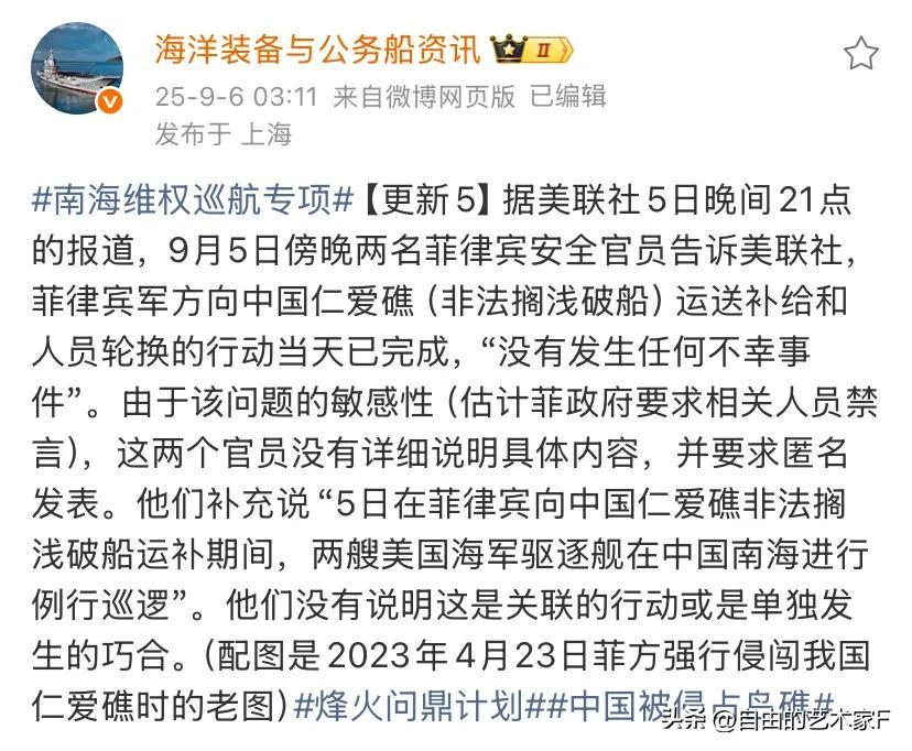 直到9月6日的时候,美联社报道,菲律宾军方宣称,在周五菲方已经成功向非法坐滩的“马德雷山”号登陆舰运送了食品、燃料,并完成了人员轮换。并且特地强调没有发生任何不幸的事件。但是却意外的对过程和细节保持沉默。